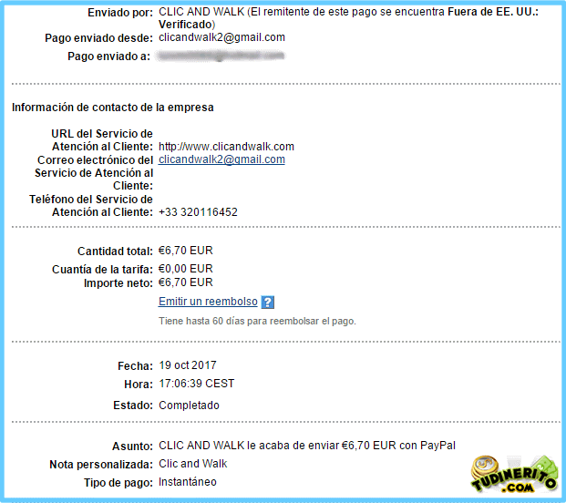 Os adjunto un comprobante de ClicAndWalk. El pago corresponde a ayer (19 de octubre). Los pagos se suelen hacer todos los lunes. Puedes elegir cobrar mediante PayPal o transferencia bancaria. El mínimo para poder cobrar es de 4 euros.