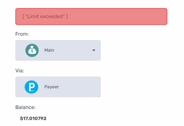El siguiente error que he visualizado en esta página es Limit exceeded. Esto suele suceder porque la página tiene un tope diario de dinero para repartir y cuando se supera ese límite, no te deja solicitar un pago. Aquí no podemos hacer nada, sólo esperar al día siguiente.