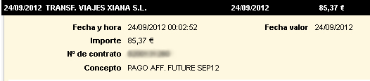 Affiliatefuture es una red de afiliación que utilizo desde que comencé a ganar dinero a través de mis páginas web. Hoy mismo, 24 de septiembre, he recibido un nuevo pago. Suelen pagan mediante transferencia bancaria y para cobrar tienes que acumular como mínimo 40€.