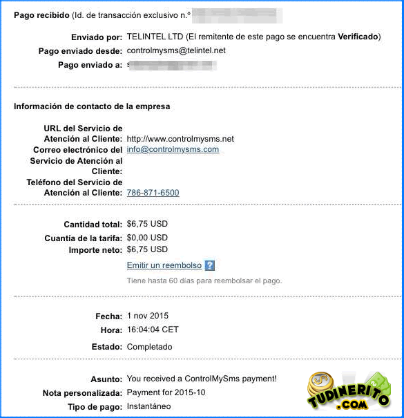 A continuación os enseño el comprobante del pago que os he mencionado arriba. Suelen pagar a primeros de mes y solo pagan mediante PayPal. La empresa que gestiona la app y realiza los pagos, se llama Telintel LTD.