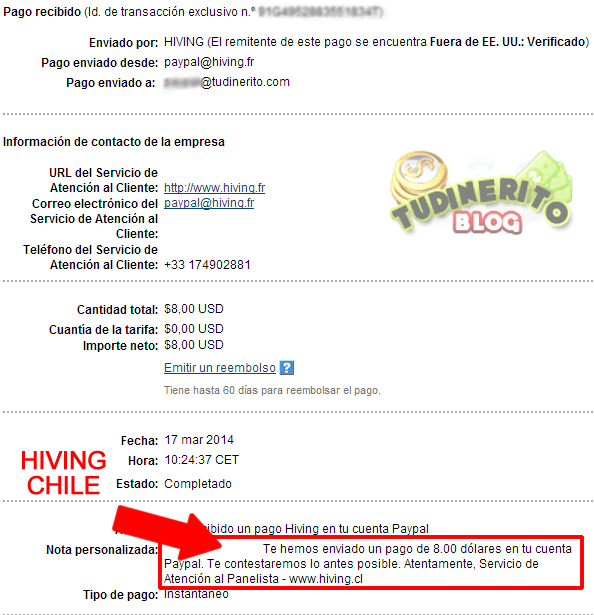 Y por último, la prueba de pago de Hiving Chile. Aquí me pagaron 8US$. En mi cuenta tenía 8.000 puntos. Podía haber cobrado cuando tenía 4.000 puntos pero preferí esperar a los 8.000 y cobrar 8US$.