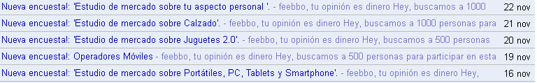 Ayer comenté este hecho por twitter y facebook y algunos me dijisteis que a vosotros no os llegaron las encuestas. Para que nadie dude de mis palabras os adjunto una captura de las encuestas que he recibido. Han sido 5 encuestas entre el 16 y 22 de noviembre. Como sabéis, cada vez que hay una nueva encuesta Feebbo te envía un email. Pincha en la imagen para verlo más grande.