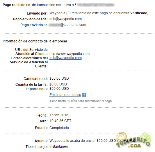 ¿Que si Uento sigue pagando? ¡Por supuesto! La semana pasada cobré 50 dólares. Como siempre, el pago fue automático. Os enseño el comprobante (la empresa que lleva Uento se llama Waypedia):