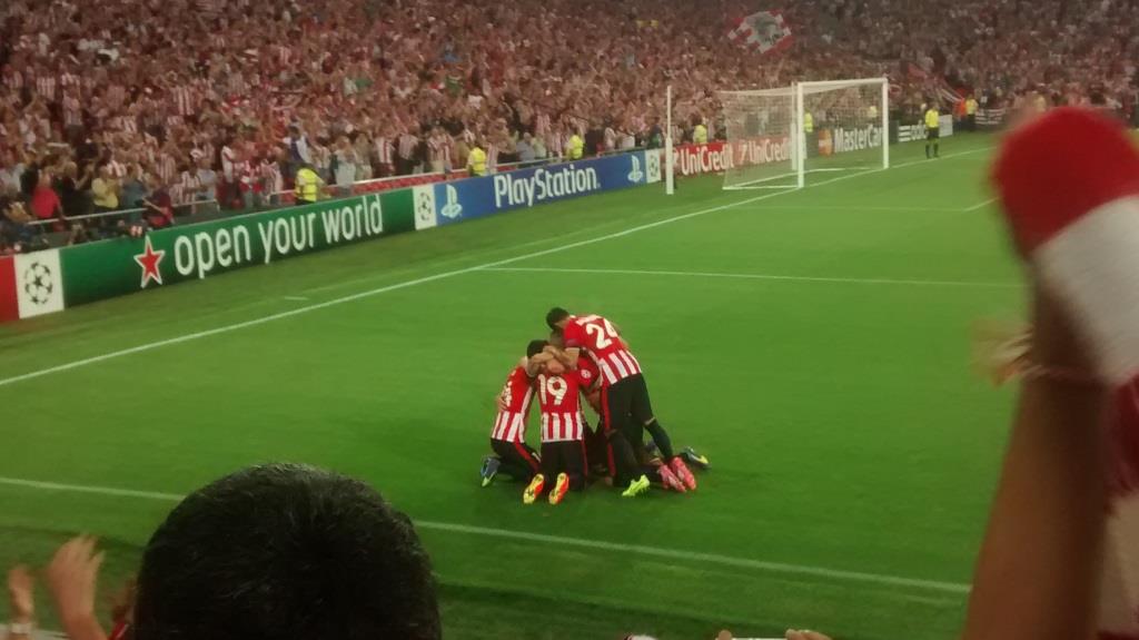 Ese día no se me olvidará nunca. Fue emocionante escuchar el himno de la Champions en el nuevo estadio y sobre todo el momento en que Aduriz marcó el segundo gol (el partido terminó 3-1) y daba el pase al Athletic para la fase de grupos. Los jugadores vinieron a celebrar el gol a escasos metros donde estaba yo. Momento que inmortalicé con mi teléfono móvil, como no podía ser de otra manera. 😀