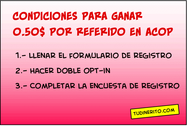 A partir de este mes, ya no será tan fácil ganar con los referidos en American Consumer Opinion. Hasta ahora era suficiente con que el referido se registrase y confirmase su cuenta. De aquí en adelante el referido tendrá que reunir una serie de condiciones si queremos ganar el medio dolar por su recomendación.